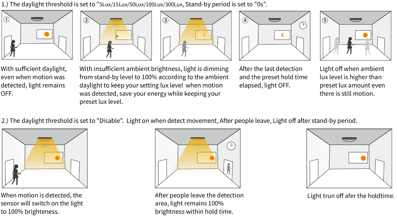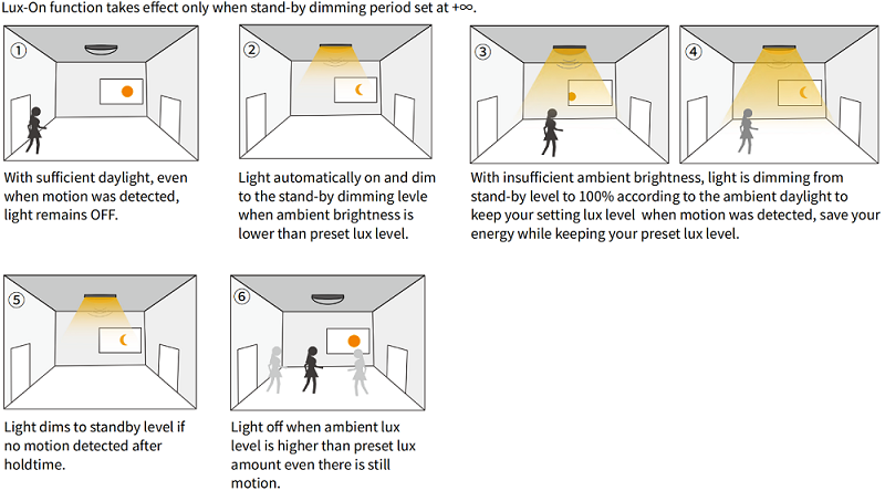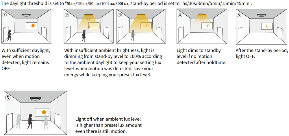 डुअल-पीडी तकनीक की बदौलत, MC004-S02R सेंसर प्राकृतिक रोशनी और कृत्रिम एलईडी लाइट के बीच अंतर बता सकता है। जब परिवेशीय प्रकाश सेटिंग मान से कम होगा, तब भी सेंसर आपके प्रकाश जुड़नार को चालू कर देगा, यहां तक कि कोई गति का भी पता नहीं चलता है। जब परिवेशीय प्रकाश सेटिंग मान तक होता है, तो सेंसर अभी भी गति होने पर भी प्रकाश जुड़नार को बंद कर देगा।