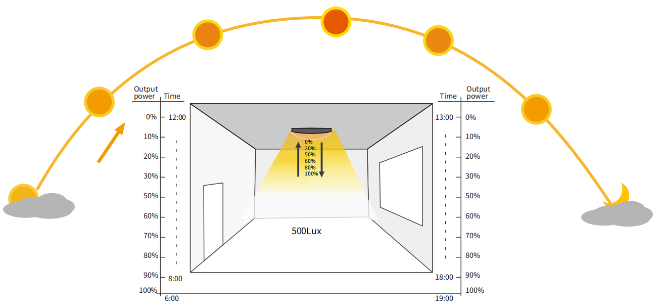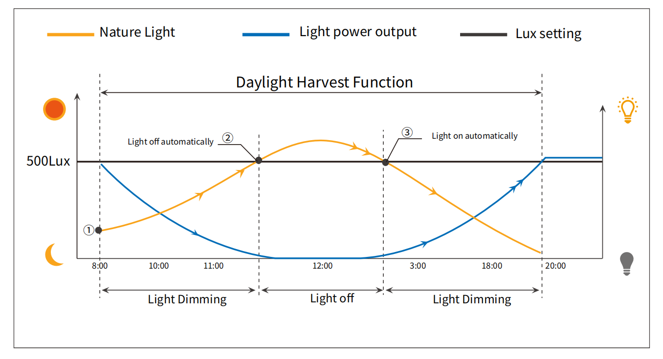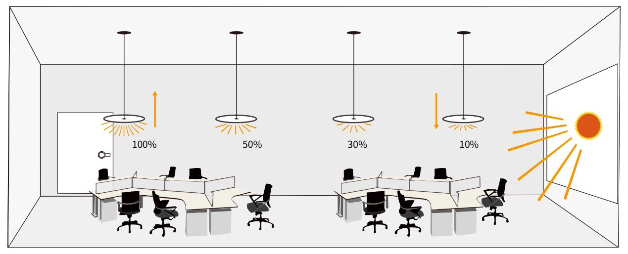 डेलाइट हार्वेस्टिंग - स्वचालित रूप से परिवेश प्रकाश की तीव्रता को महसूस करता है और ऊर्जा खपत को अनुकूलित करने के लिए लैंप की चमक को गतिशील रूप से समायोजित करता है;