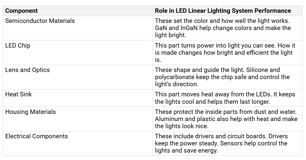 एलईडी लीनियर लाइटिंग बड़े स्थानों पर चमकदार रोशनी देने के लिए विशेष भागों का उपयोग करती है। प्रत्येक भाग रोशनी को अच्छी तरह से काम करने और लंबे समय तक चलने में मदद करता है।नीचे दी गई तालिका मुख्य भागों को दर्शाती है और वे क्या करते हैं: