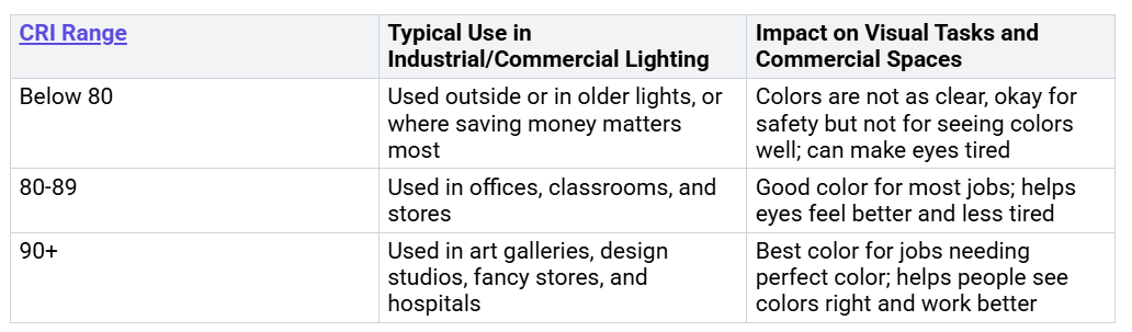 लंबे, पतले फिक्स्चर में एलईडीसमान रोशनी देने में मदद करें. इससे आपकी आंखों को आसानी होती है और आपको बेहतर देखने में मदद मिलती है। व्यवसायों में, रंग सटीकता महत्वपूर्ण है। औद्योगिक रैखिक प्रकाश व्यवस्था में आमतौर पर एक होता हैसीआरआई 80 और 90 के बीच. 80 या उससे अधिक का सीआरआई अधिकांश नौकरियों के लिए अच्छा है। 90 या उससे अधिक का सीआरआई उन स्थानों के लिए सर्वोत्तम है जहां रंग सटीक होना चाहिए। उच्च सीआरआई का अर्थ है बेहतर रंग, अधिक आराम और सुरक्षित कार्य। इससे लोगों को अपना काम बेहतर ढंग से करने में मदद मिलती है।