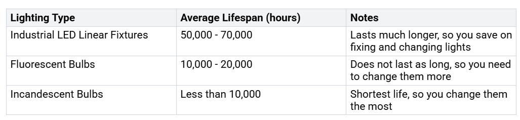अधिकांश एलईडी लीनियर लाइटें 50,000 से 70,000 घंटे तक काम करती हैं। वे लंबे समय तक चलते हैं, इसलिए व्यवसायों को उन्हें बार-बार बदलने की आवश्यकता नहीं होती है।