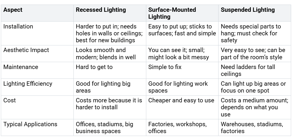 सतह पर लगी रैखिक रोशनी सीधे छत या दीवारों पर जाती है। इस प्रकार का उपयोग व्यवसायों में बहुत अधिक किया जाता है। 2023 में यह बनाआधे से अधिक बाज़ार.कई कंपनियां इसे चुनती हैं क्योंकि इसे लगाना आसान और सस्ता है। ये लाइटें समान रोशनी देती हैं और कार्यालयों, कार्यशालाओं और गैरेज में अच्छी तरह से काम करती हैं। उन्हें ठीक करना आसान है क्योंकि आप उन तक पहुंच सकते हैं। यह प्रकार उन स्थानों के लिए सर्वोत्तम है जहाँ आपको तेज़ और सरल सेटअप की आवश्यकता होती है।