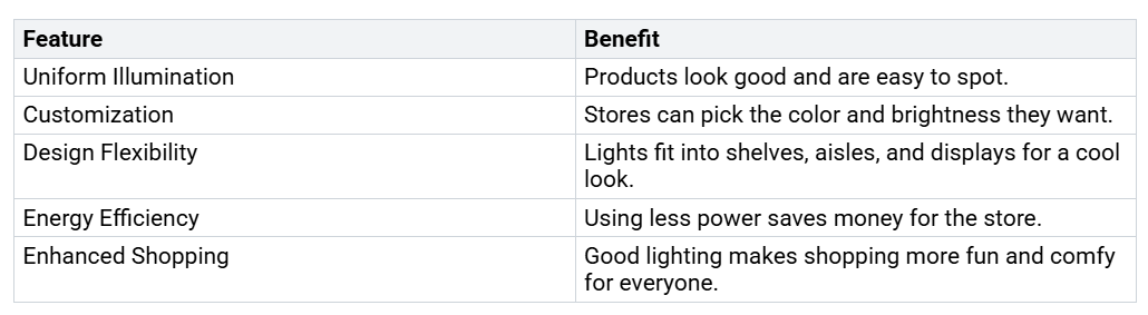 स्टोर उत्पादों को दिखाने और खरीदारी को मज़ेदार बनाने के लिए रैखिक प्रकाश व्यवस्था का उपयोग करते हैं। उज्ज्वल, समान प्रकाश ग्राहकों को सब कुछ स्पष्ट रूप से देखने में मदद करता है। कोई काले धब्बे या कठोर छाया नहीं हैं।नीचे दी गई तालिका से पता चलता है कि रैखिक प्रकाश व्यवस्था दुकानों में कैसे मदद करती है: